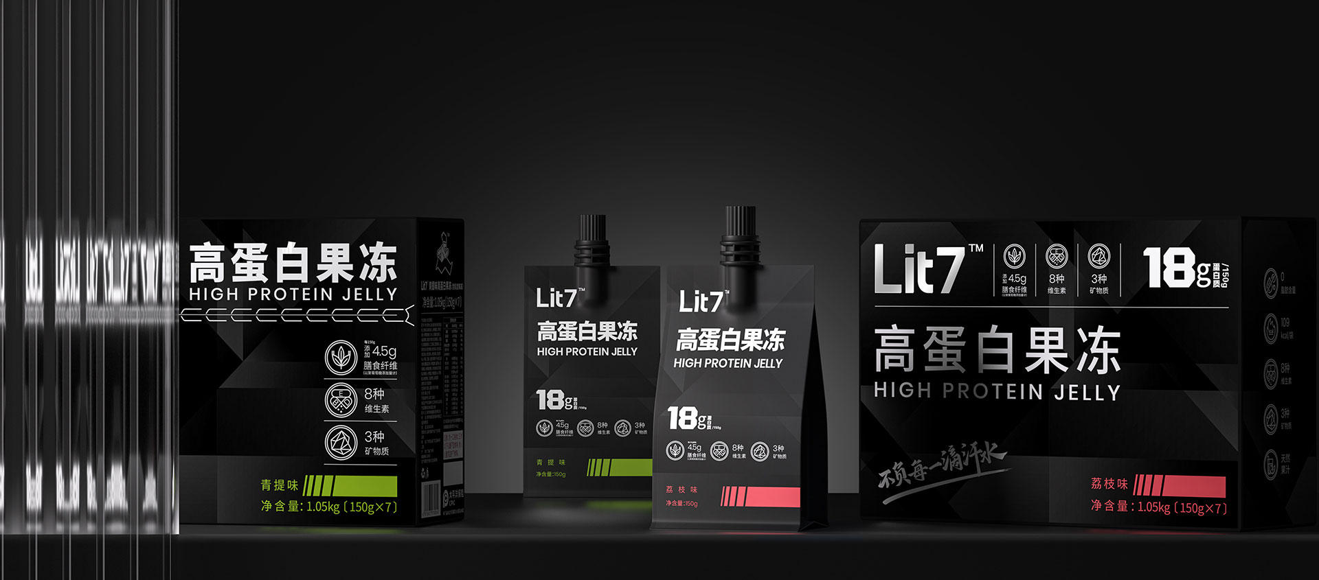 Lit 7以解決健身(shēn)和減脂人(rén)士補充蛋白質為(wèi)目标,專注打造蛋白質類健康食品。通過中英文加圖形的形式,進行LOGO設計。品牌英文字體(tǐ)進行藝術化(huà)處理(lǐ),配合筆畫的特殊處理(lǐ),既具有力量感而又不失英文的識别性與美感。奔跑的小人(rén)元素成為(wèi)整個(gè)視(shì)覺的點睛之筆,表現(xiàn)了(le)運動、活力、燃的品牌氣質。包裝以符合健身(shēn)和減脂人(rén)士審美的酷黑顔色作(zuò)為(wèi)主色調,将功能(néng)标簽及賣點進行圖标化(huà)視(shì)覺呈現(xiàn),幫助消費者迅速捕獲産品信息。