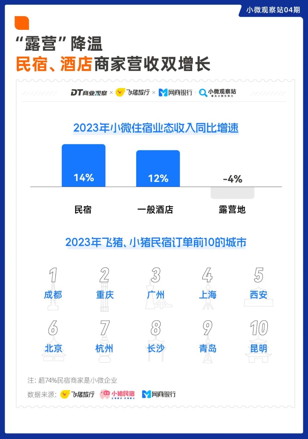 據網商(shāng)銀行小微觀察站(zhàn)的統計,2023年小微住宿業中,民(mín)宿營收同比增長了(le)14%,較一(yī)般酒店(diàn)高出2個(gè)百分(fēn)點。而露營地等業務(wù)逐漸降溫,呈現(xiàn)出負增長的态勢。